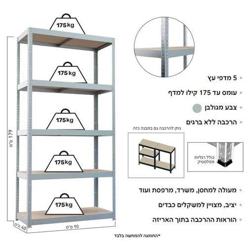 - סט 5 מדפים פח + עץ לעומס 175 ק"ג למדף Metalkas מבית AUSTRALIA HOME