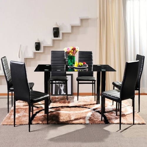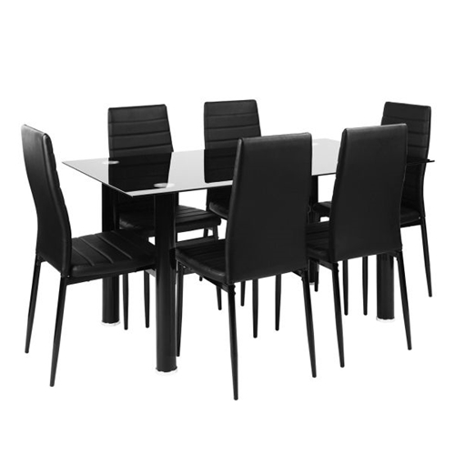 פינת אוכל בעיצוב מודרני הכוללת שולחן עשוי זכוכית מחוסמת במראה אלגנטי מיוחד ושישה כיסאות תואמים.