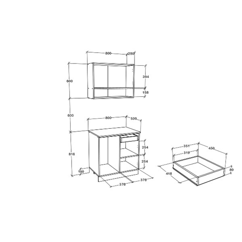 בארון העליון זוג דלתות ומדף פתוח ובארון התחתון זוג דלתות ומגירה עם מסילה טלסקופית.