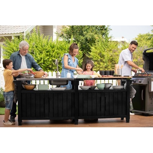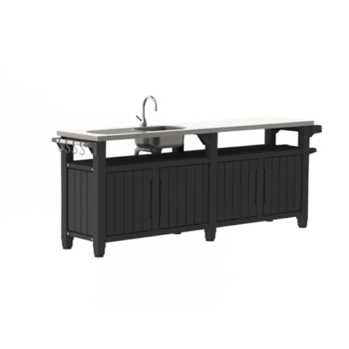 - מטבח חוץ גדול עם כיור ומשטח נירוסטה בגוון אפור כהה דגם יוניטי שף KETER