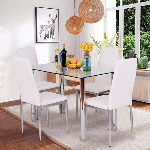 פינת אוכל בעיצוב מודרני הכוללת שולחן עשוי זכוכית מחוסמת במראה אלגנטי מיוחד וארבעה כיסאות תואמים.