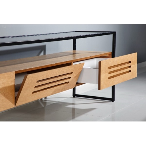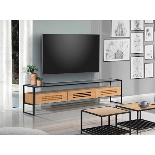 מערכת מושלמת לסלון הכוללת מזנון ו - 2 שולחנות, עשויה מברזל בצבע שחור ומשילוב של זכוכית, עץ ופורניר.