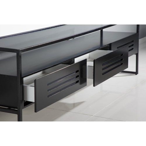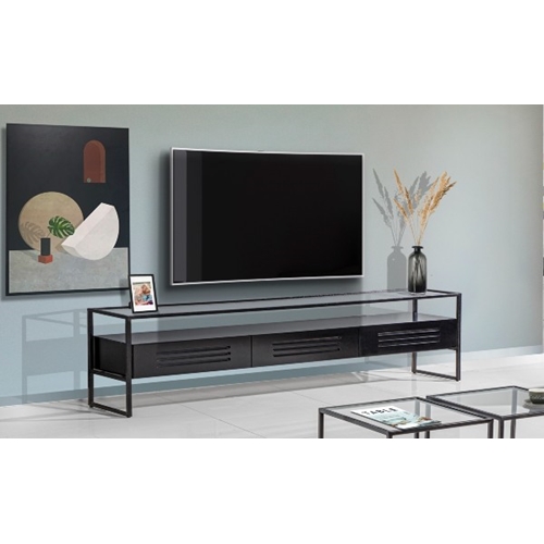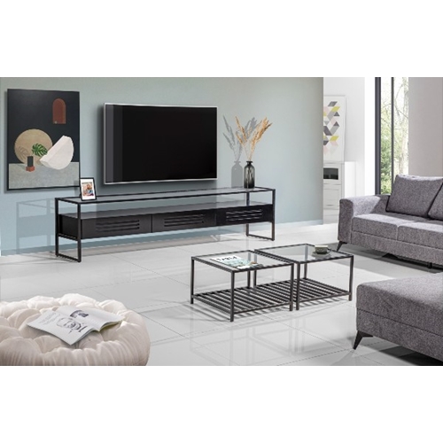 מערכת מושלמת לסלון הכוללת מזנון ושני שולחנות, עשויה מברזל בצבע שחור ומשילוב של זכוכית, עץ ופורניר שחור.
