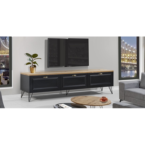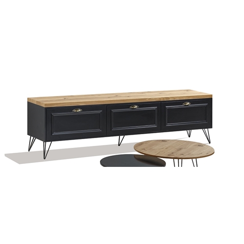 מזנון RJ04 הגבוה מכניס עוצמה, יופי ומראה קלאסי לסלון עם גוף שחור מסיבי ופלטת עץ בחלק העליון.
