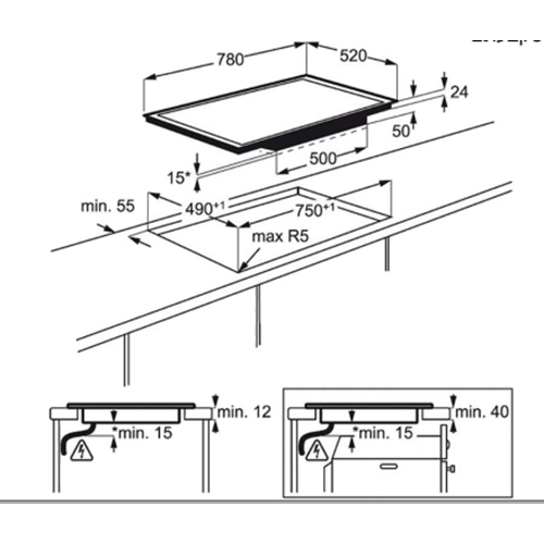 - מידות הגומחה (גxרxע) במ"מ: 50* 750 * 490 (בנוסף דרוש מרווח מינימלי לאוורור של 2ס"מ מתחת לכיריים)