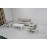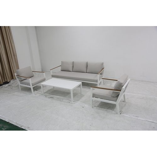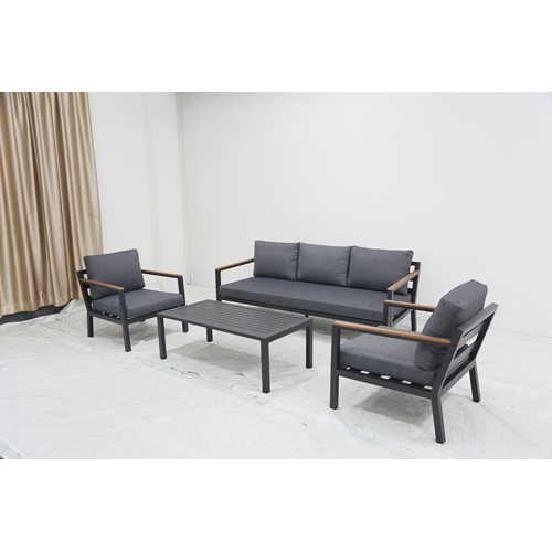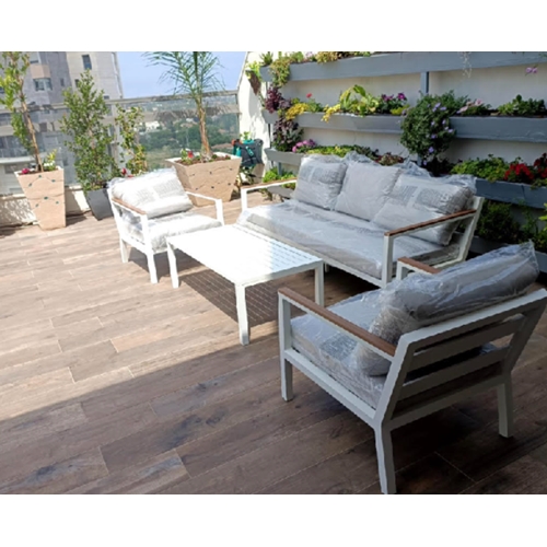 הסט כולל 4 חלקים - ספה תלת, 2 כורסאות יחיד וכן שולחן קפה מאלומיניום ללא זכוכית מחוסמת ולכן בטיחותי יותר עם ילדים