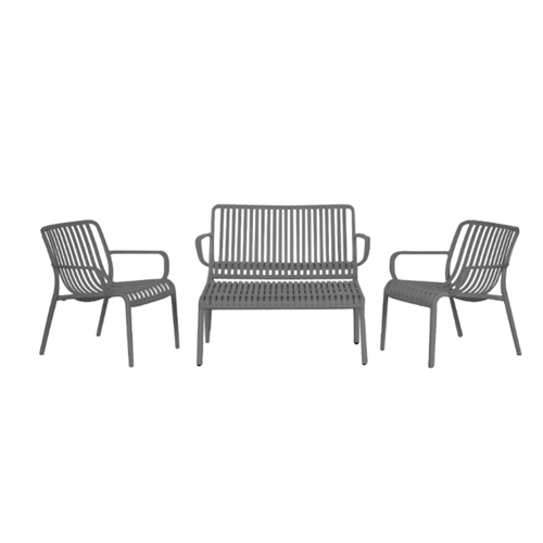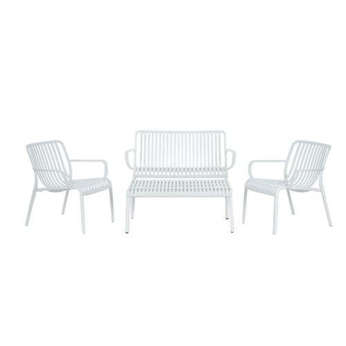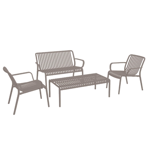 הסט כולל ספה דו-מושבית, שני כורסאות יחיד ושולחן קפה. הסט בנוי מחומרים עמידים בפני תנאי חוץ, תוך שמירה על עיצוב אלגנטי, קליל ונוח לשימוש.