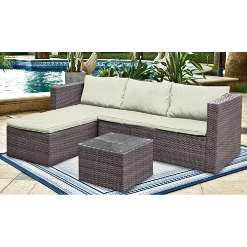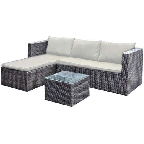 הסט מצופה ראטן סינטטי איכותי המתאים לכל מזג אוויר בגווני אפור וקרם.