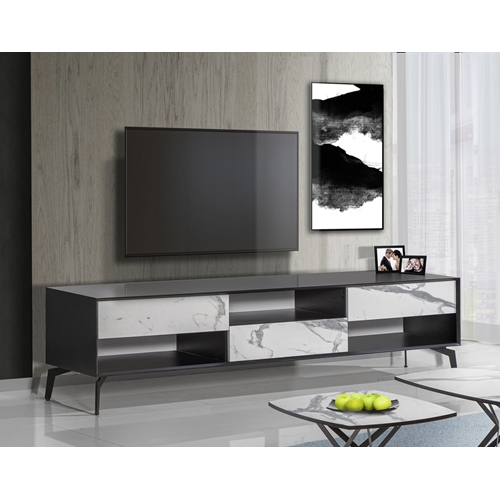 המשלב צביעה בגוון שיש לבן, גימור שחור ורגלי ברזל שבמזנון יש שלוש מגירות עם טריקה שקטה.
