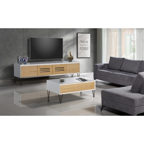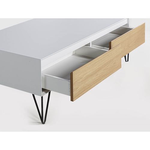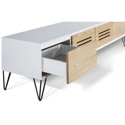 המזנון משלב שתי מגירות עם טריקה שקטה וגם שתי קלאפות עם חריצים לממיר, כולן בגימור עץ אלון בהיר.