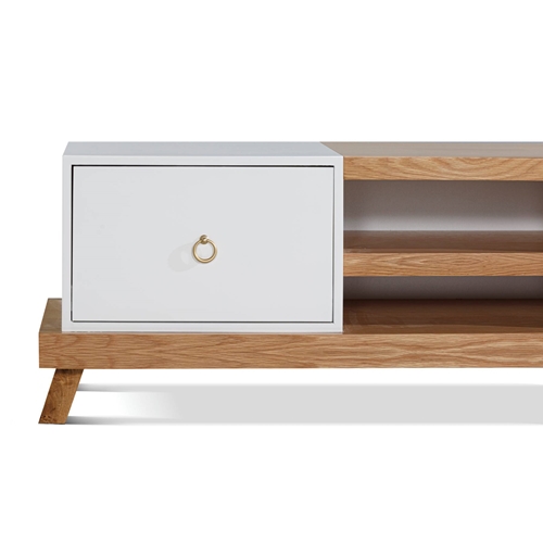 שילוב מרגש של עץ וצביעה לבנה עם נגיעות עגולות של מתכת בידיות.