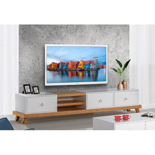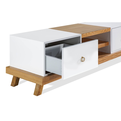 מזנון מרהיב המשלב צביעה בגוון לבן, במה, רגליים ומדפי עץ מאסיביים.