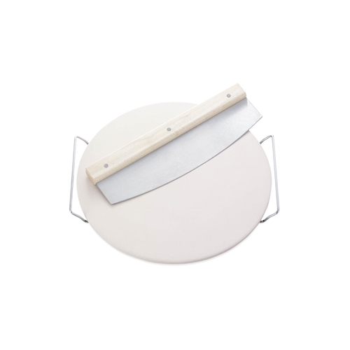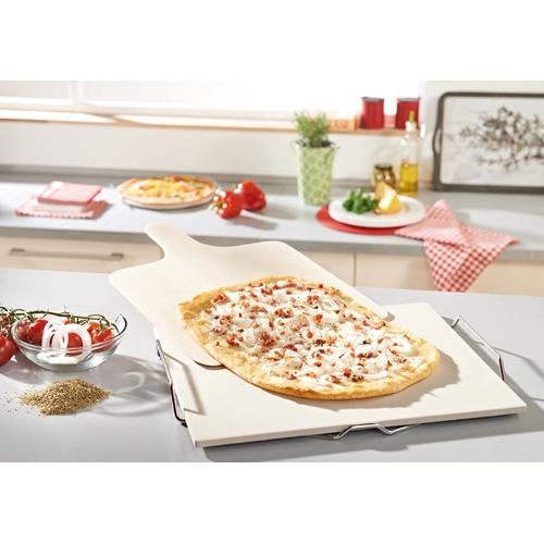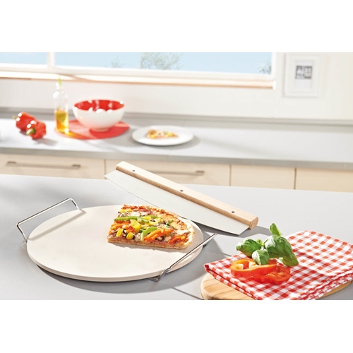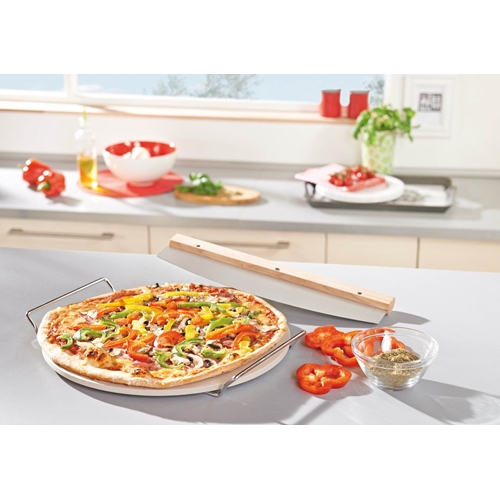 - אבן שמוט 33 ס"מ עם מעמד הגשה ממתכת וסכין חיתוך איכותית להכנת פיצות מושלמות מבית LEIFHEIT גרמניה