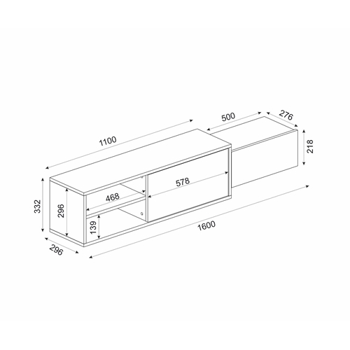 שני מדפים להנחת ממיר או פריטים יומיומיים נוספים ו-2 יחידות אחסון עם קלאפה.