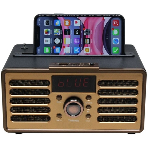 רדיו נייד משולב עם רמקול עוצמתי בעיצוב רטרו כולל תושבת ייעודית לסמארטפון.