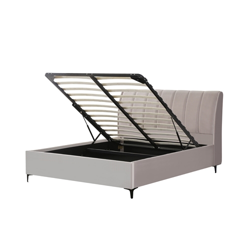 ארגז מצעים מובנה, מרווח, מתרומם מחזית המיטה, עם מנגנוני בוכנות להרמה קלה ונוחה כמוצג בתצלום.