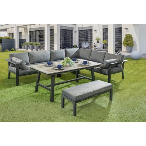 מערכת ישיבה פינתית מלדיב לגינה או למרפסת בעלת ספה גדולה ועמוקה, ספסל הדום ושולחן גדול ומפנק.