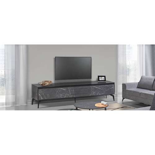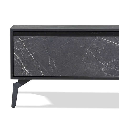 - מזנון סלוני הכולל שתי מגירות וקלאפה מרכזית גימורים דמוי שיש שחור עם רגלי ברזל - LEONRARDO