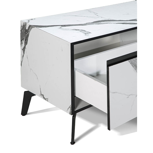 מגירות וקלאפה בגימור דמוי שיש לבן ומגרעות שחורות והשולחנות בגימור דמוי שיש לבן.