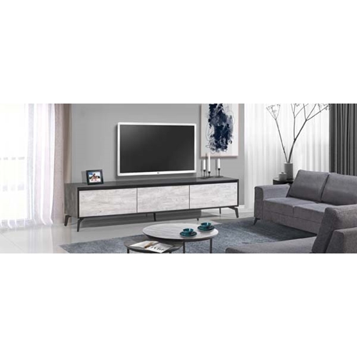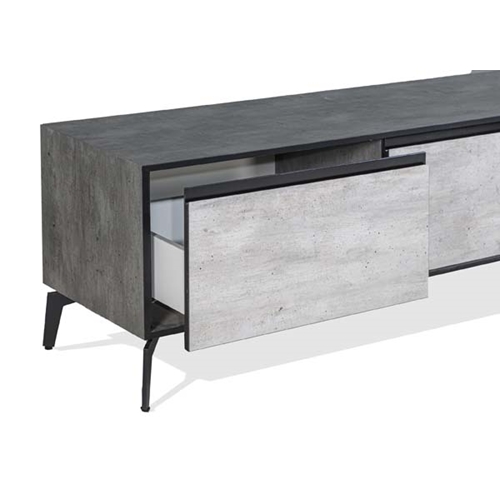- מזנון מרהיב כולל שתי מגירות ענקיות וקלאפה מרכזית. גימורים בגווני פרקט אפרפר ואפור בהיר רגלי ברזל - LEONRARD