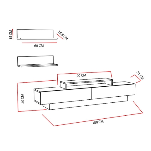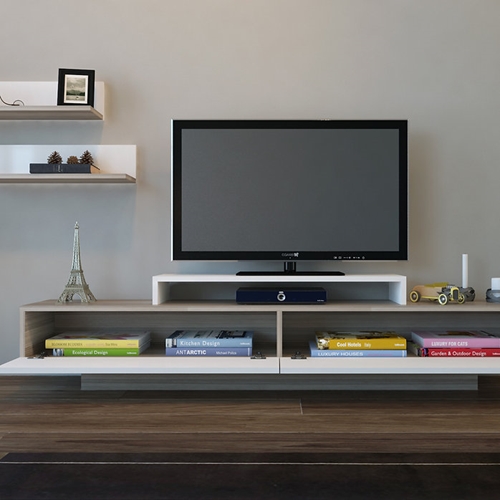 מזנון טלוויזיה מעוצב שישדרג לכם את הסלון בשילוב שני מדפי תליה תואמים.
