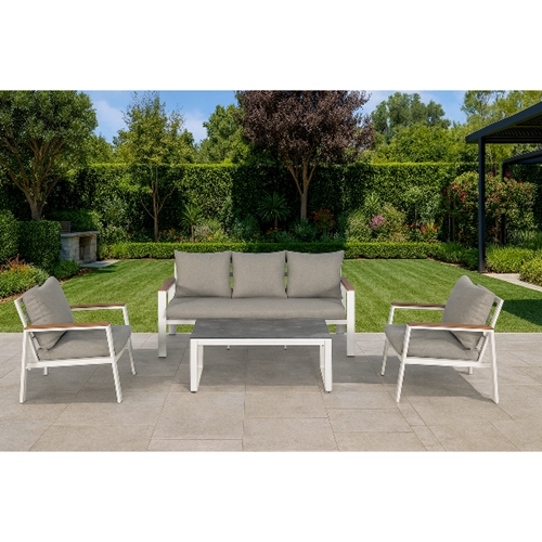 סט ריהוט גן הכולל ספה תלת מושבית ו-2 כורסאות יחיד ושולחן.